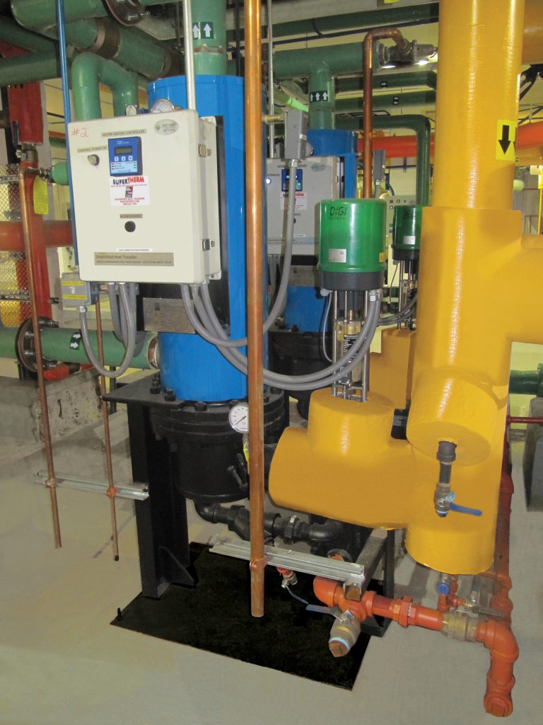 DHT and East Coast Mechanical custom designed a preheater as part of the system, as well. The condensate from the domestic water heater, along with the combined hub buildings heating condensate from the steam radiators, all run through the specially designed preheater. The water-to-water preheater captures the sensible heat from the condensate while preheating the incoming domestic water to significantly reduce the steam consumption at the control valve.